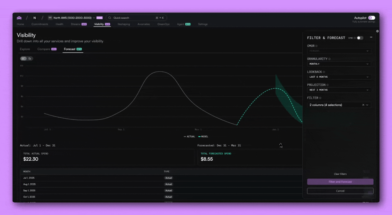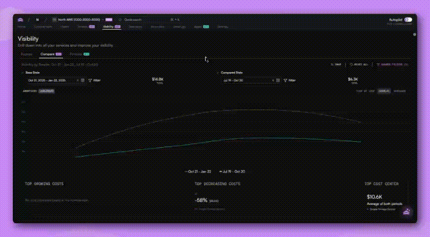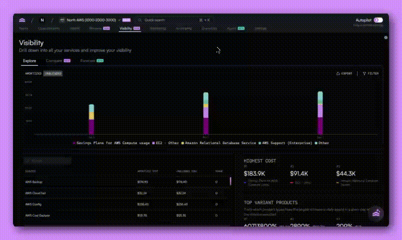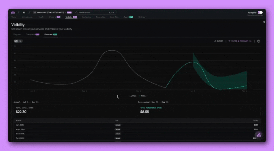 With this release, Visibility becomes a connected workflow. You can explore your cloud costs, compare different configurations or time ranges, and forecast future spend using the same filters and groupings throughout.