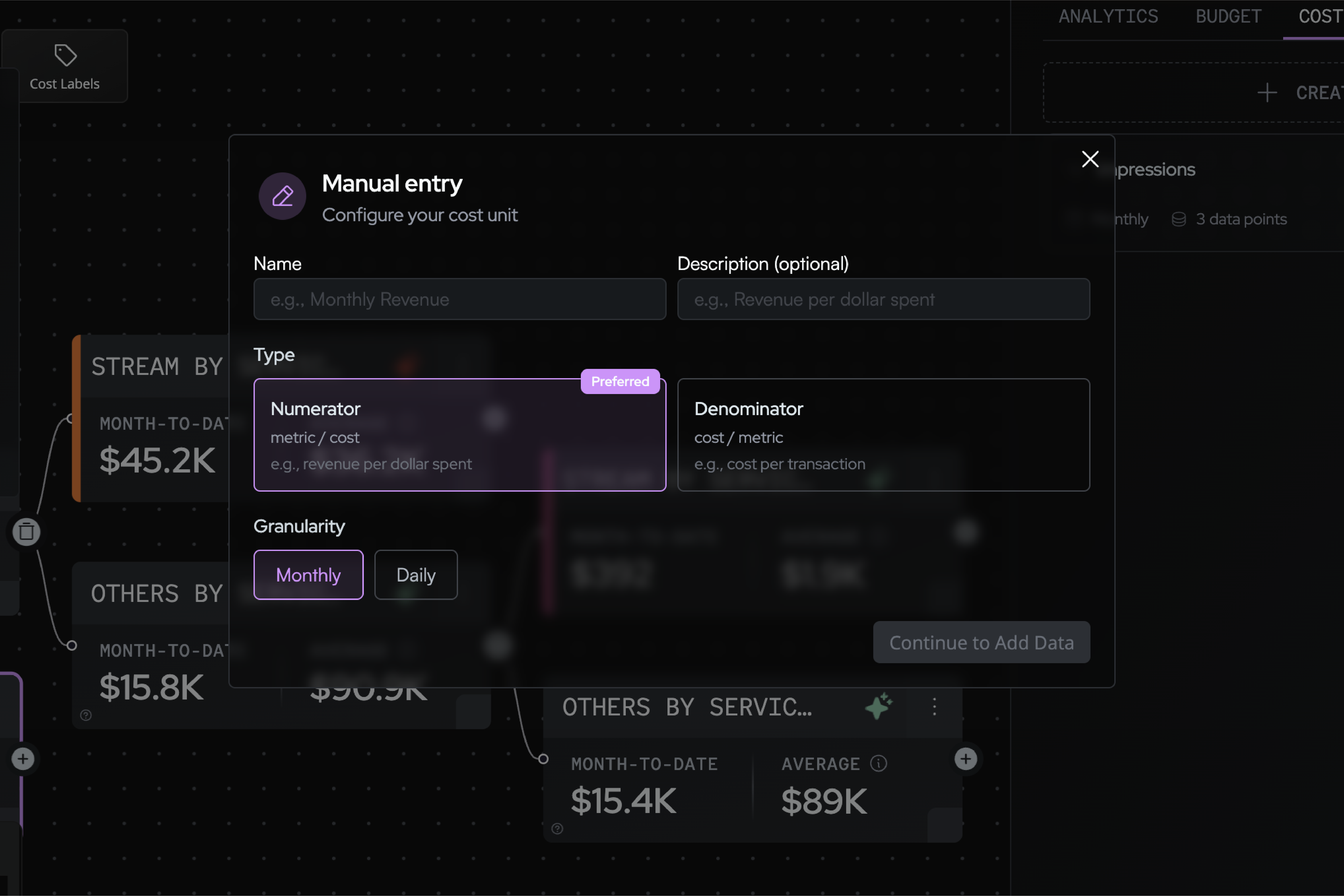 Cost Units are intentionally flexible. You define the metric, decide the granularity, and choose how it maps to your Business Units. There’s no fixed schema or prescribed KPI. If it matters to your business, you can measure it.
