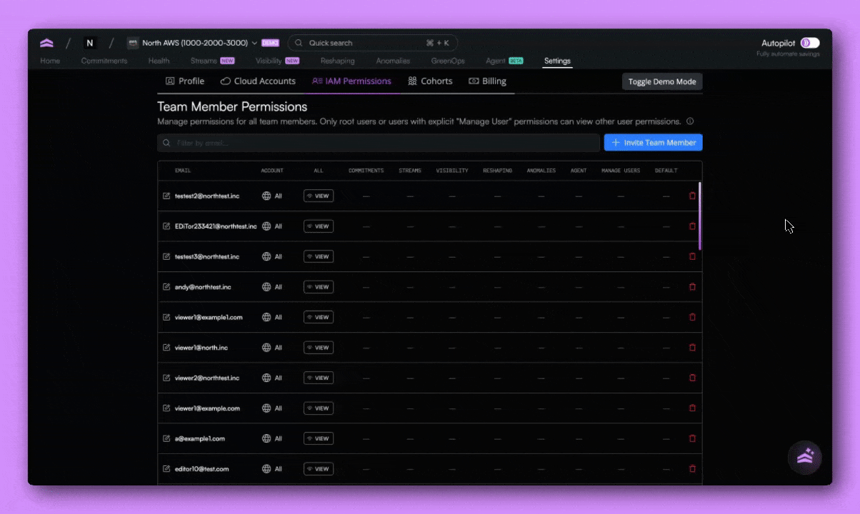 Manage access to cloud cost data with IAM Permissions in North. Control visibility by account and feature, and share cost insights without overexposing data.